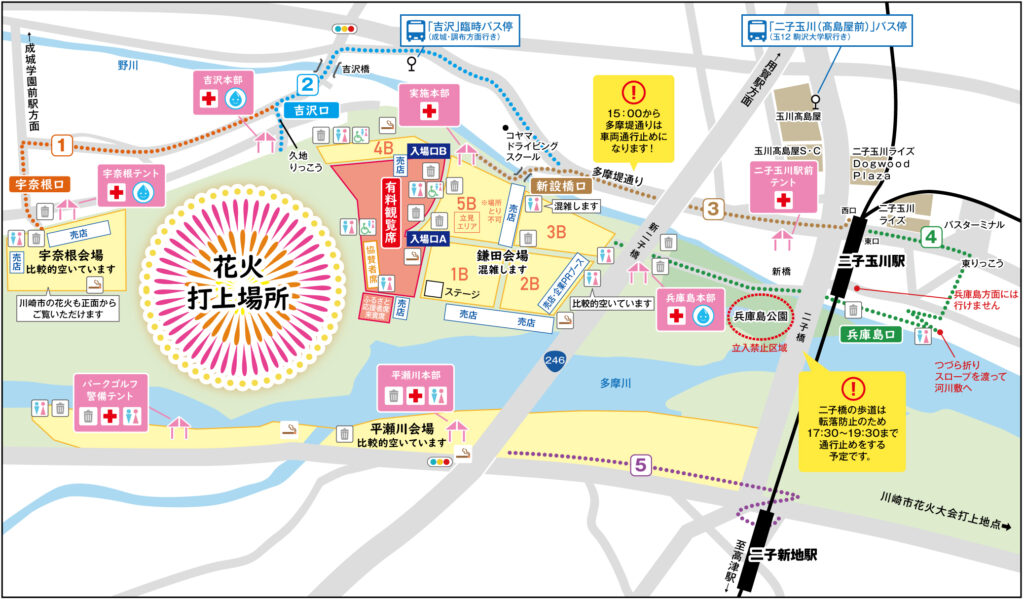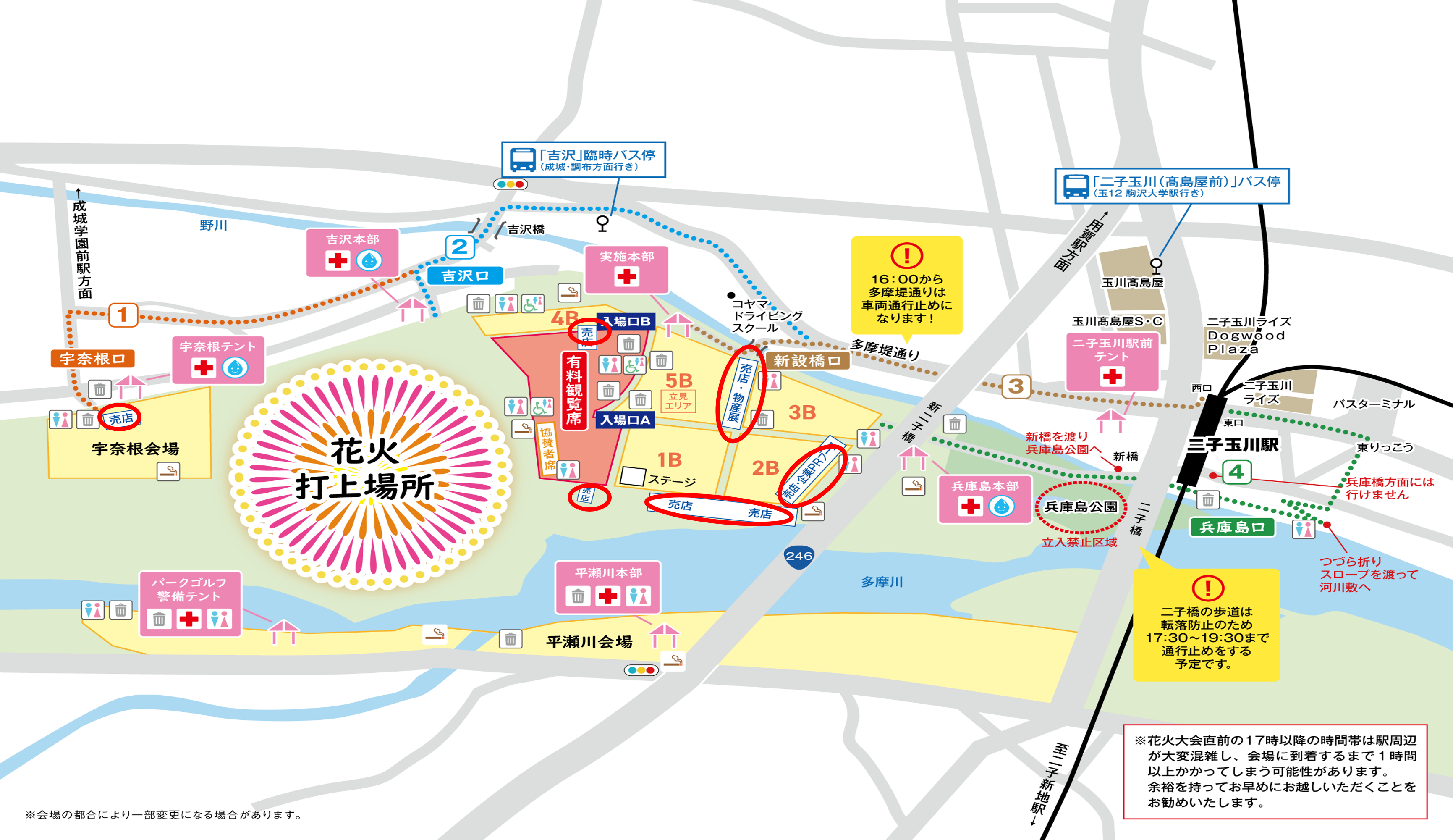 - 二子玉川駅、会場周辺道路、会場全て混雑します。特に二子玉川駅は大混雑が予想されるので、時間に余裕を持ってお出かけ下さい。
