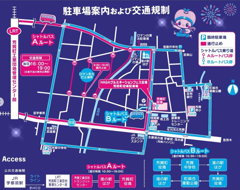 • 臨時駐車場は、5か所設けられておりシャトルバスで「道の駅はが」「芳賀町役場」まで行くことができます。