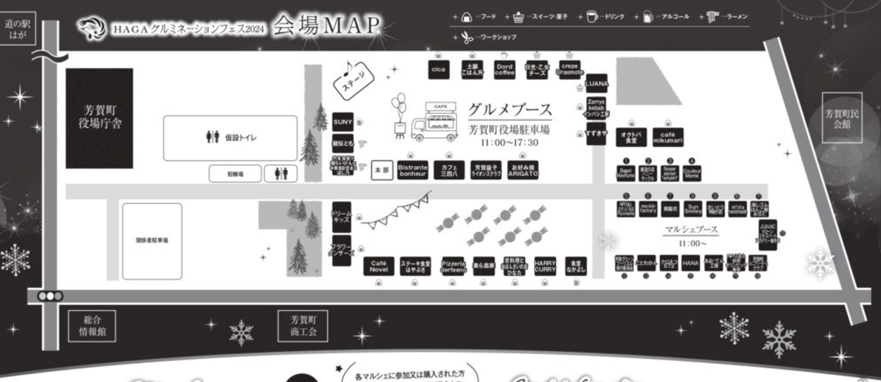 • 芳賀ロマン花火の花火打ち上げ会場になる「道の駅はが」およびHAGAグルミネーションの会場となる「芳賀町役場駐車場」ともにキッチンカーなどの出店があります。