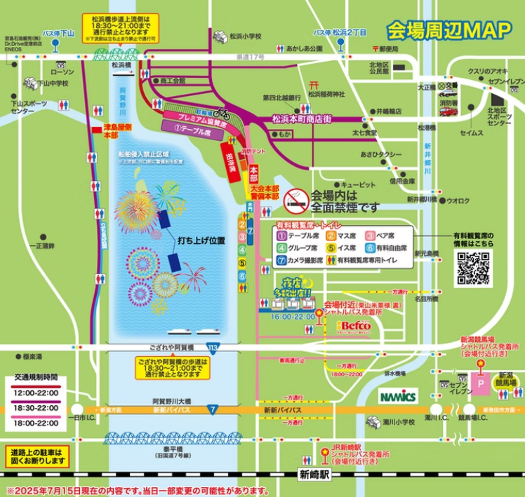 - 早い所では12時から交通規制が行われ、会場周辺は車両通行止めになります。