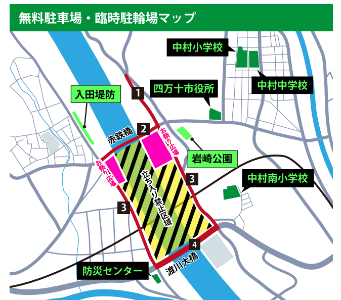 - 無料駐車場は5か所設けられています。台数に限りがあるので早めに駐車できるように時間に余裕を持ってお出かけください。