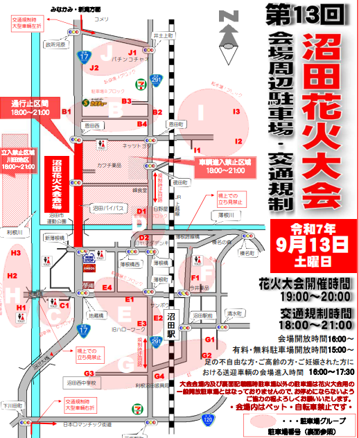 沼田花火では無料臨時駐車場が設けられています。