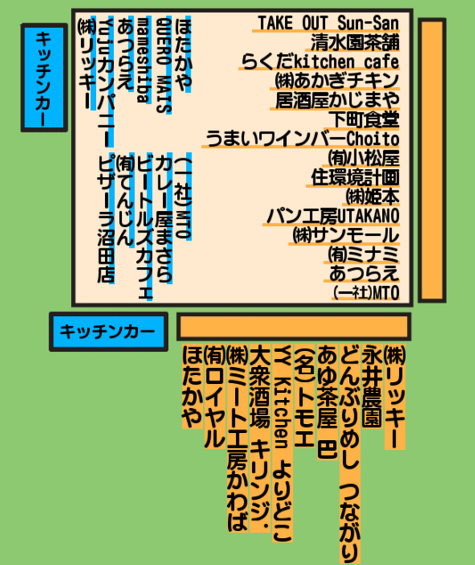 出店エリアは、一般観覧席付近で、飲食店ブースや特産物ブース、キッチンカーが多数出店します。