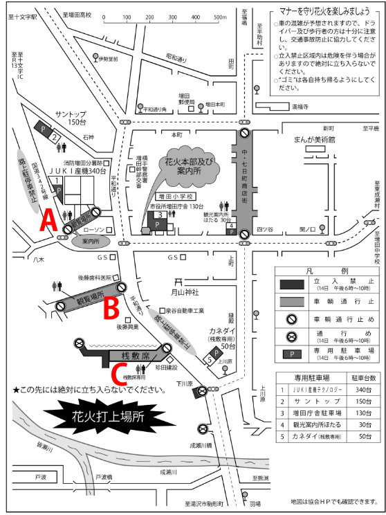 - 会場近くに無料の臨時駐車場が設けられています。台数に限りがあるので、早めにお出かけください。