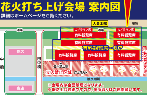 - 屋台の出店場所は、足利側と渡良瀬川の北側になります。